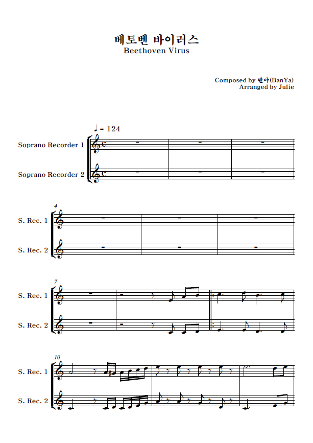 베토벤 바이러스(Beethoven Virus) - 반야(BanYa) 소프라노 리코더 2중주 악보