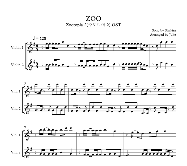 ZOO(주토피아2 OST) - Shakira 바이올린 2중주 악보