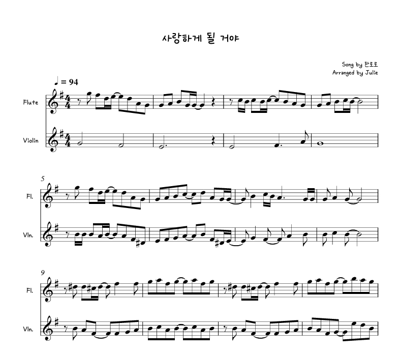 사랑하게 될 거야 - 한로로 플룻 바이올린 2중주 악보