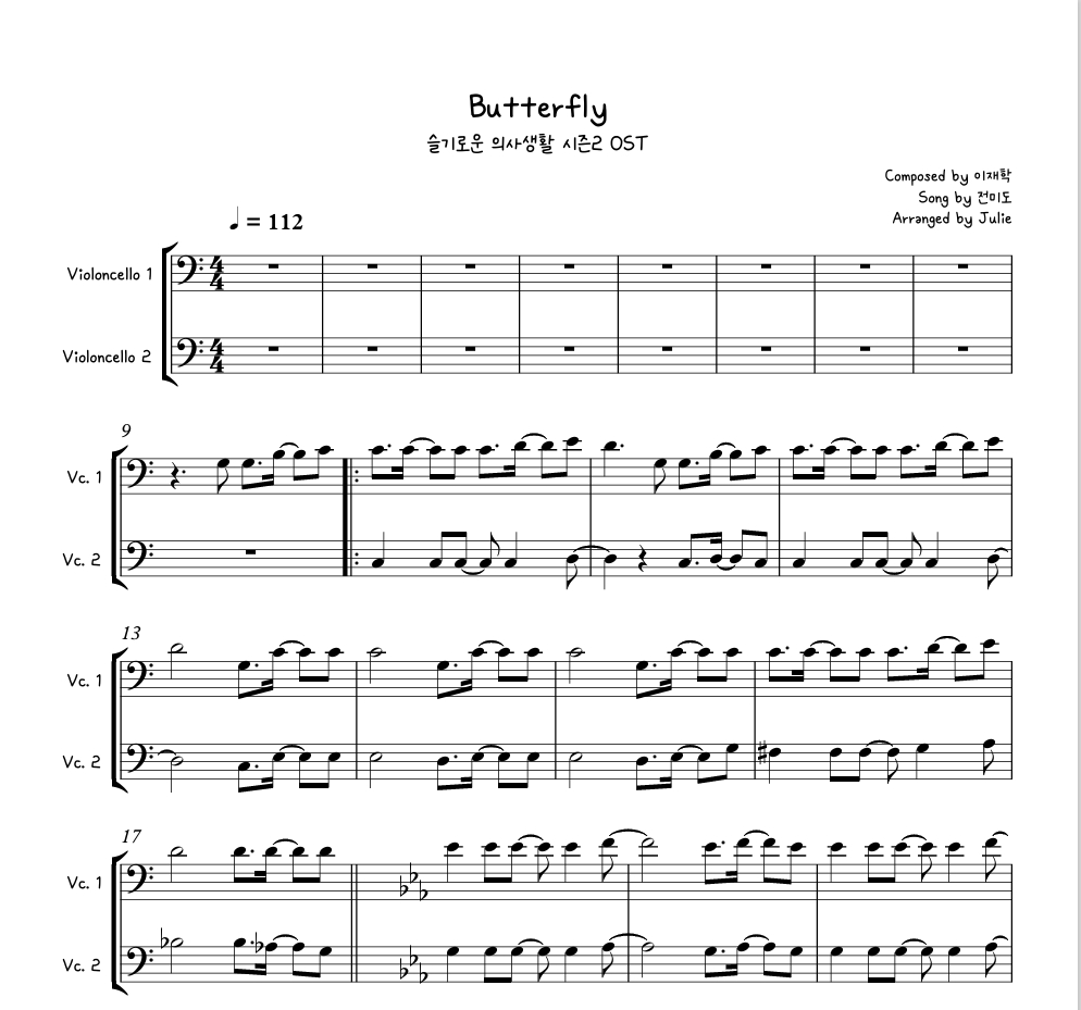 Butterfly - 전미도(슬기로운 의사생활 시즌2 OST) 첼로 2중주 악보
