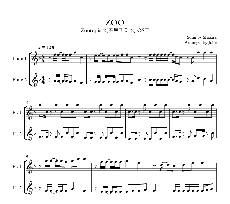 ZOO(주토피아2 OST) - Shakira 플룻 2중주 악보